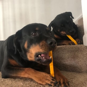 I couldn’t even get the package open before I had five dogs at my feet going for this chewie. It seems to be in good shape and size and they like it well. I’ll update when I have an idea of durability.